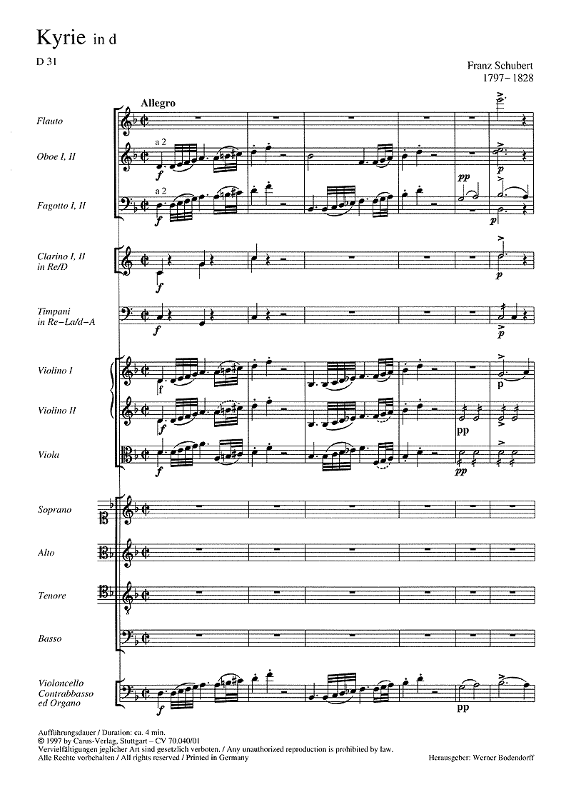 Kyrie für eine Messe in d (VoSoST; Chor SATB; Flöte; 2 Oboen; 2 Fagotte; 2 Trompeten in Bb; Pauken; 2 Violinen; Viola; Generalbass), Orgelauszug