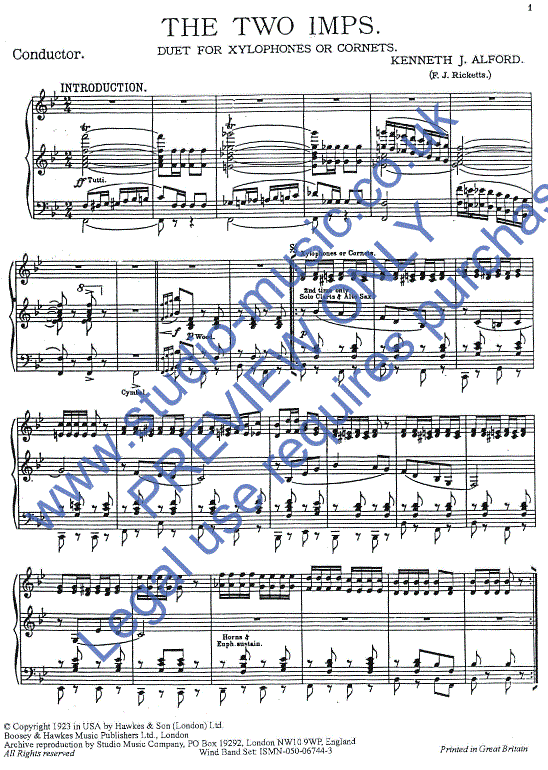 Zusatzinfo/Inhalt "Two Imps" von Kenneth J. Alford ist eine brillante und unterhaltsame Komposition, die sowohl für Xylophon- als auch für Kornettsolisten geeignet ist. Das Stück zeigt Alford von einer anderen Seite als seine berühmten Märsche und hebt seine Fähigkeit hervor, humorvolle und technisch anspruchsvolle Musik zu schreiben. "Two Imps" bleibt ein fester Bestandteil des Repertoires für Blasorchester und Brassbands und begeistert Musiker und Zuhörer gleichermaßen durch seinen spritzigen Charakter und die virtuosen Anforderungen an die Solisten.