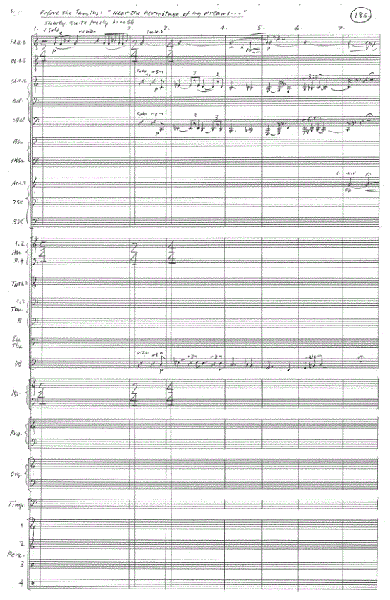 Instrumentation: Soprano, Alto, Tenor, Bass, 2 Flutes (1 dbl. Pice.), 2 Oboes (2 dbl. Eng. Hn.), 2 Clarinets, Bass Clarinet, Contrabass Clarinet (Eb), 2 Bassoons (2 dbl. CBsn.), 2 Alto Saxophones (both dbl. Sop. Sax.), Tenor Saxophone, Baritone Saxophone, 4 Horns, Trumpet 1 in C (dbl. Pice. Tpt.), Trumpet 2 in C ( dbl. Flugelhom), 2 Trombones, Bass Trombone, Euphonium, Tuba, Double Bass, Harp, Piano, Organ, Timpani, Percussion 1 (Vibe, Crotales, Orchestra Bells, Xylophone, Chimes, Small Gong), Percussion 2 (Marimba, Crotales, Orchestra Bells, Lg. Sus. Cymbal, Sm. Sus. Cymbal, Chimes, Crash Cymbals, Small Gong, Medium Gong), Percussion 3 (Bass Drum, Crash Cymbals, Sm. Wood Block, Sm. Sus. Cymbal, Lg. Sus. Cymbal, 2 Anvils, (different sizes), 3 Small Gongs, Medium Gong, Marimba, Snare Drum, Tenor Drum, Chimes, 2 Brake Drums, (different sizes), Conga, Crotales, Bongo, Hi Hat Cymbal, Lion’s Roar, Maracas, Tuned Gongs (E, Eb), Xylophone, Sleigh Bells, Tam Tam), Percussion 4 (Tam Tam, Gong, Cabasa, Sm. Sus. Cym., Lg. Sus. Cym., Bass Drum, Tom Toms, Maracas, Sm. Shaker, Crotales, Castanets, Tambourine). |