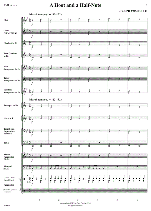 Ziel dieses einfachen Marsches ist es, Anfängern das Aussehen und den Rhythmus von Halbnoten näherzubringen. Alle Instrumente außer Snare und Bassdrum lernen diesen wichtigen Anfängerrhythmus zu spielen. Alle Instrumente spielen die Melodie, und es gibt reichlich Gelegenheit, an Phrasierung und dynamischen Kontrasten zu arbeiten.